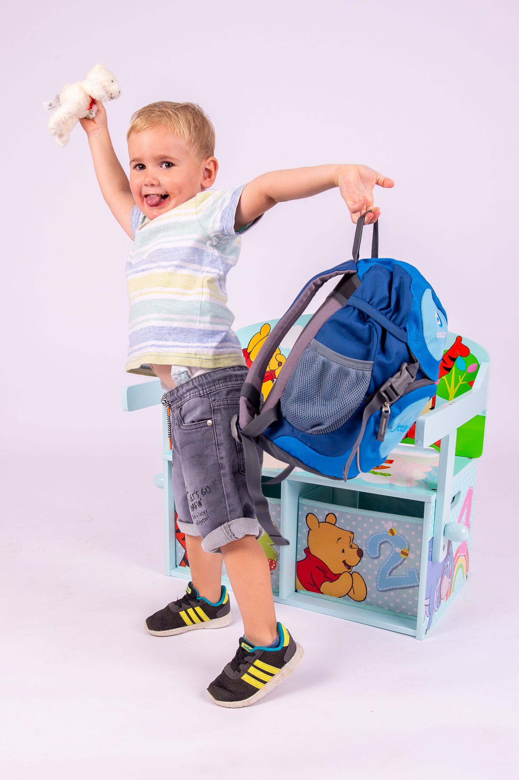 Der Schmusebär ist ein Klassiker unter den Kinder-Rucksäcken. Mit nur einer Schnalle und dem kinderfreundlichen Kordelzug am Hauptfach ist er leicht zu bedienen. Außerdem schützt er die Kleinen, mit dem zusätzlich reflektierenden Print, auf ihrem Weg in den Kindergarten. Besondere Schätze können Mädels und Jungs in der Deckeltasche oder in den elastischen Seitenfächern verstecken. Den Schmusebär gibt es in drei farbenfrohen Varianten: In Blau, Grün und Rosa mit bunten Motiven. Dank des höhenverstellbaren Brustgurts bleiben die Träger auch bei wilden Abenteuern fest auf den Schultern. Im Inhalt mit folgender Standard – Befüllung inklusive.