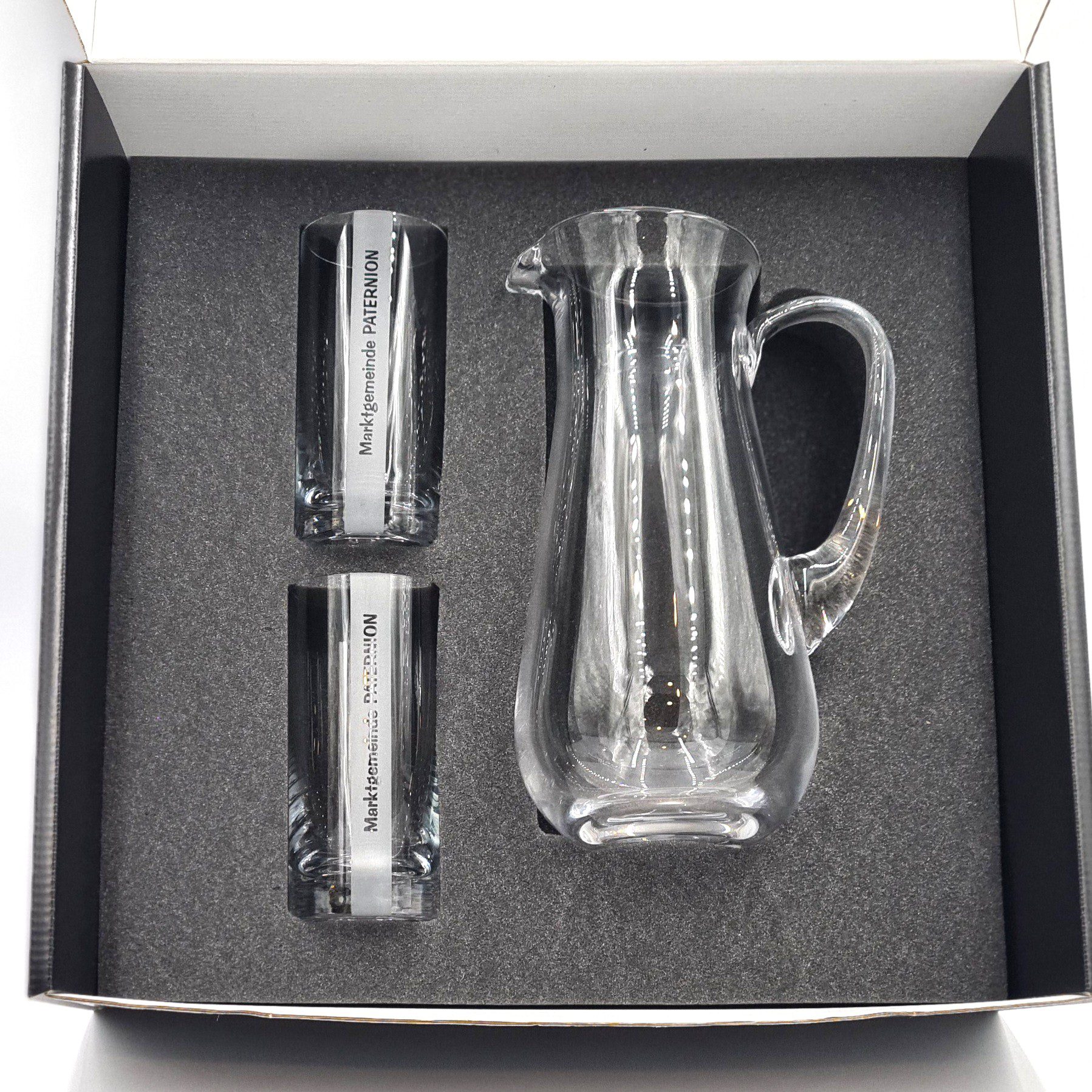 Exklusives Wasserset bestehend aus Wasserkrug 1,2l handgefertigt sowie 2 Trinkgläser im edlen Geschenkkarton mit passgenauer Schaumstoffeinlage für optimalen Halt.