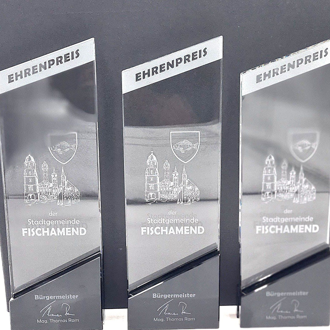 Exklusive Glastrophäen in schräger Ausführung mit schwarzem Glanzsockel in unterschiedlichen Höhen.